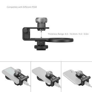 SmallRig MagSafe / Cold Shoe Universal 2-in-1 SSD Holder 4779 is designed for connecting USB-C external hard drives during smartphone photography. It is compatible with 8.0 - 16.0mm / 0.3 - 0.6in thick SSDs, primarily Samsung T7, Samsung T7 Shield, and Samsung T9 models.