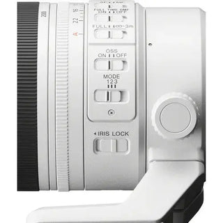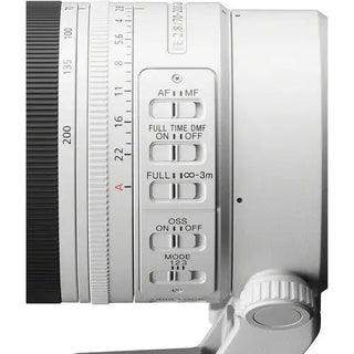 The white lens barrel features three programmable focus control buttons, an AF/MF switch, a focus range limiter switch, and Optical Steady Shot control switches. Image stabilization combats camera shake, especially at longer focal lengths, and the added Mode 3 function increases framing stability when shooting moving subjects.