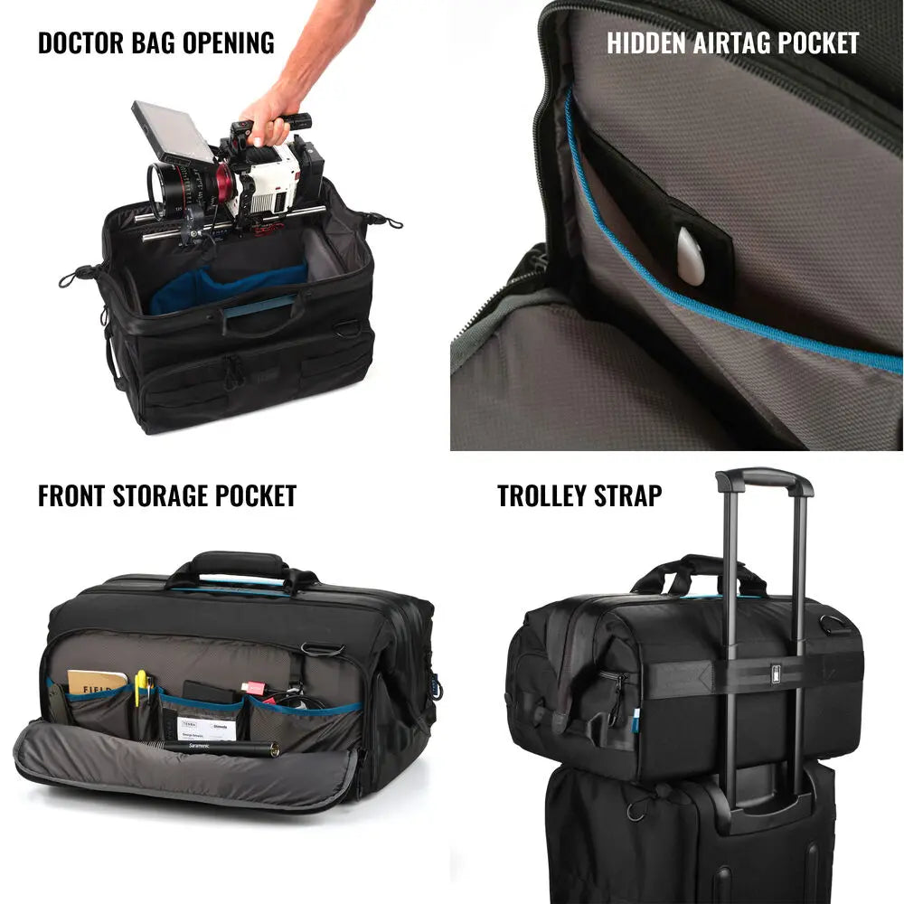 Tenba's 32L Cineluxe V2 Shoulder Bag 21 in black can hold mirrorless, DSLR, or movie camera setups up to 18" long, along with any attached accessories. You may store your camera equipment with the baseplate, matte box, monitor, and microphone attached using the height and length measurements, ensuring you're prepared to film when you get there. It has a doctor bag-style opening along the middle for convenient access to stored equipment and to preserve the bag's footprint when opened.